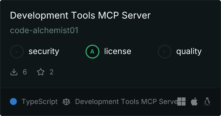 curl -X GET 'https://glama.ai/api/mcp/v1/servers/code-alchemist01/development-tools-mcp-Server'